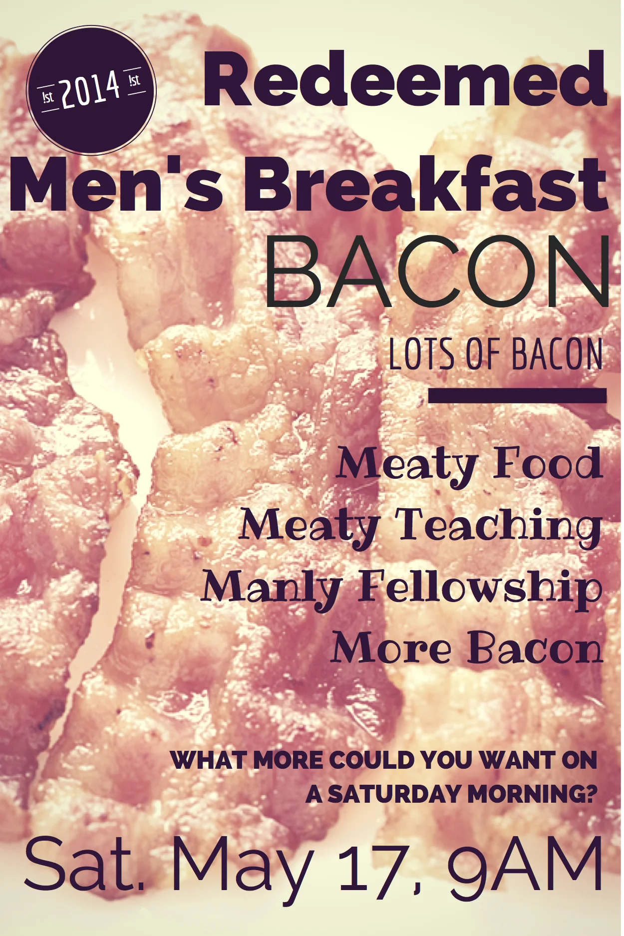 Please join us on Saturday, May 17th as we gather together as the men of our new church to break bread, receive the Word, pray, and fellowship. Eat bacon. The Pastors will be preparing a manly and I mean MANLY meal, come hungry both spiritually and physically! The food and teaching will be MEATY. Please RSVP by calling the church office or anyone of the Pastors.